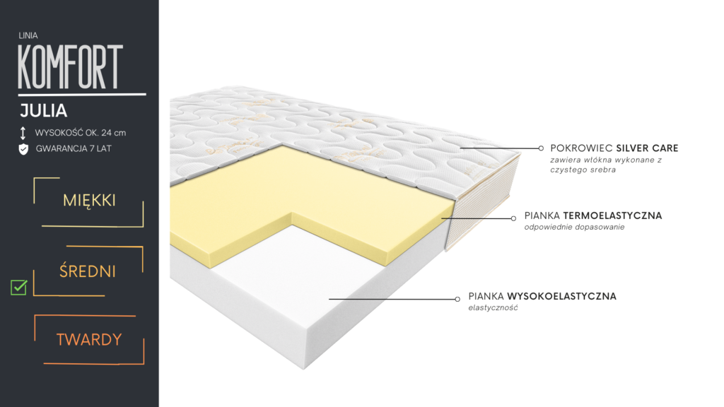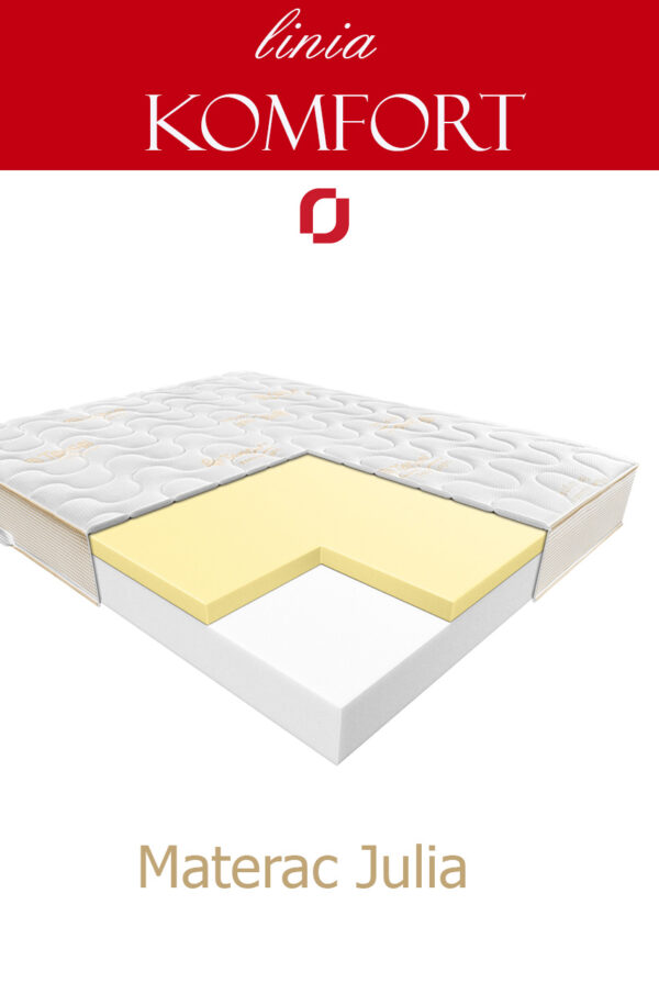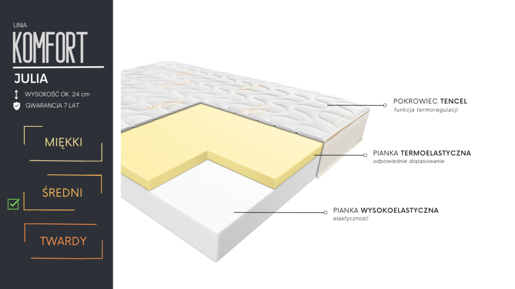 Wnętrze materaca Julia stworzone jest z idealnie uzupełniających się pianek: wysokoelastycznej i termoelastycznej. Taka kombinacja surowców zapewnia wysoką wygodę, ale również stabilne i solidne podparcie kręgosłupa. Pierwsza z pianek charakteryzuje się wysoką sprężystością i elastycznością, zapewnia doskonałe podparcie Twojego ciała na całej jego długości, bez względu na pozycję, w której śpisz.
